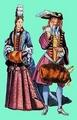 Камзолы мужчин стали чуть более приталенными, с расширяющимися фалдами, и удлинились до уровня колена. Их можно было теперь застсегнуть на пуговицы от ворота до низа, но носили их нараспашку. На шею повязывали роскошные шарфы. Облегающий, как и камзол, жилет доходил до колен. Узкие, длиной до колен штаны, почти скрытые камзолом, застегивались под коленом пуговицами или пряжками. Широкополую. отделанную каймой и украшенную перьями шляпу носили, приподняв поля с одной стороны или как диктовала мода.