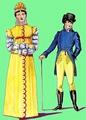 Кавалер одет в двубортный фрак с четырехугольным вырезом. Карманы фрака расположены на уровне талии; рукава узкие, расширенные и присборенные у плеча, с однотонными манжетами. Стоячий воротник отвернут у шеи, накрахмаленный воротничок достает до щек. Аксессуары включают брелок и трость.