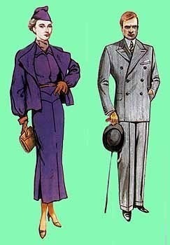 В тридцатые годы дизайн пиджачного костюма был пересмотрен, ему был придан более сильный, мужественный вид. Линия талии чуть поднялась по сравнению с ее естественным положением, пуговицы и карманы разместились гораздо выше. На рисунке представлен двубортный пиджак с лацканами, которые стали теперь короче, но шире. Плечи обработаны так, что линия плеч увеличилась, а грудь расширилась. Рукава сузились к манжету. Пиджак прилегает к бедрам. Обтягивающие в талии брюки завершались отворотами. В моде ткани в узкую полоску и мелкую клетку.